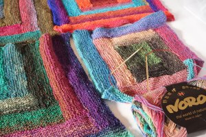 The last thing I want to show you is my magic sock blanket. I decided to embark on an epic year long project and turn my magic box of Noro Sock Yarn into a knitted blanket. Technically, it’s still on the needles, and will be for a long time, but I’ve already finished three squares! So far I’ve made two log cabin squares (one is still on the needles) and two variations on the log cabin square. I might do some mitered squares as well, or combine the two. There are lots of ways to knit a modular blanket, so I plan to change it up if I feel my excitement waning.