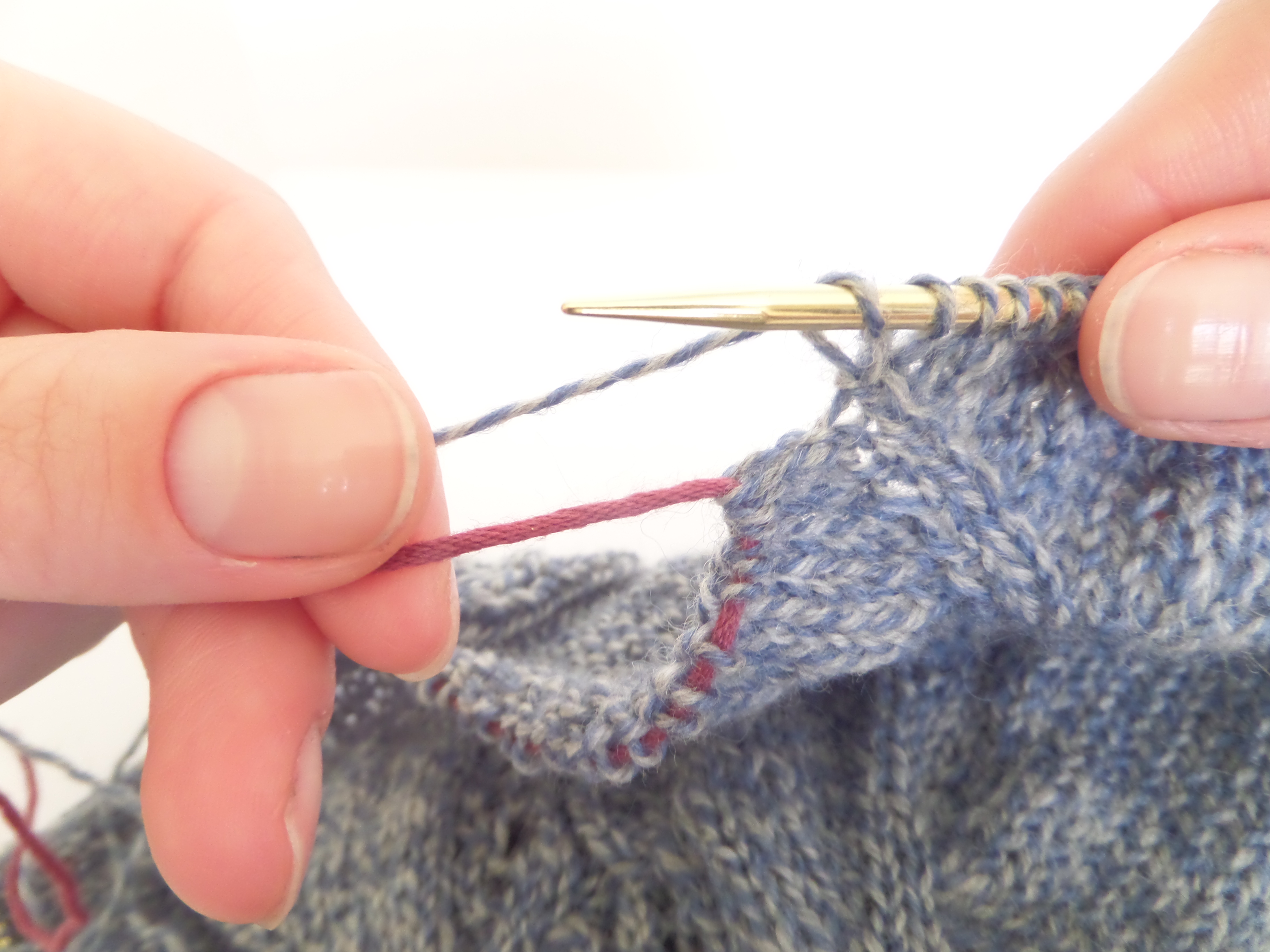 When you’re ready to return the sleeve stitches to the needle just slip the provisionally cast on stitches onto the needle too. You will notice that every other underarm stitch is mounted with the right leg to the back of the needle. You will have to turn the stitches the right way around by working into the back loop on the first row.