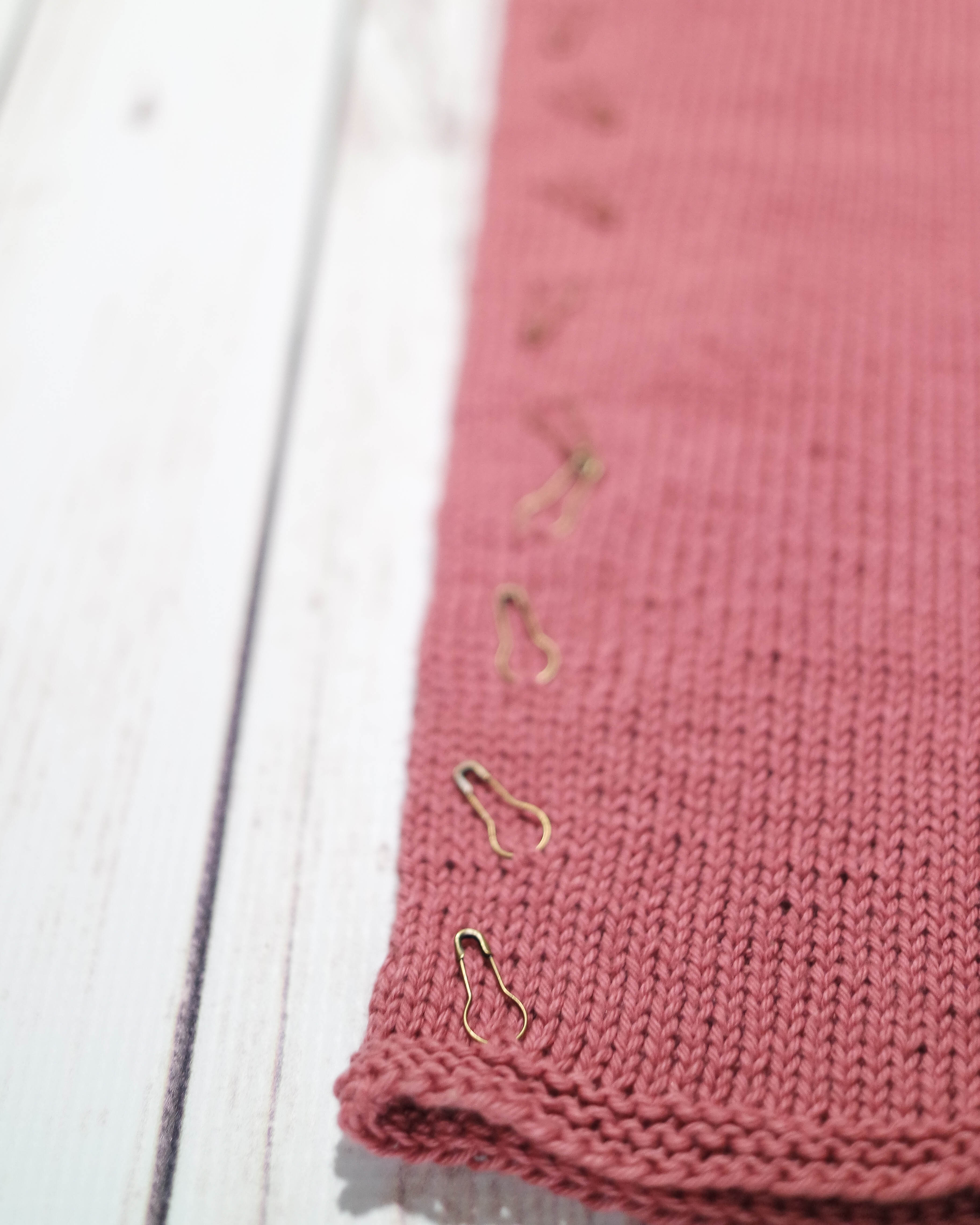 I have seen knitters use all kinds of different methods to keep track of pattern rows and repeats. Row counters, spreadsheets, a handwritten list of every row with a check mark beside it when that row is complete. I never liked any of these methods. What happens when you forget to click your row counter? Or lose your speadsheet? Or have to rip back and erase your check marks? No, I’ve found the best way to keep track of repeats in my knitting is in my knitting itself. A few years ago I discovered bulb safety pins, (shown above) which have become my favorite tools for this purpose, but before that I used coil-less safety pins or locking stitch markers.