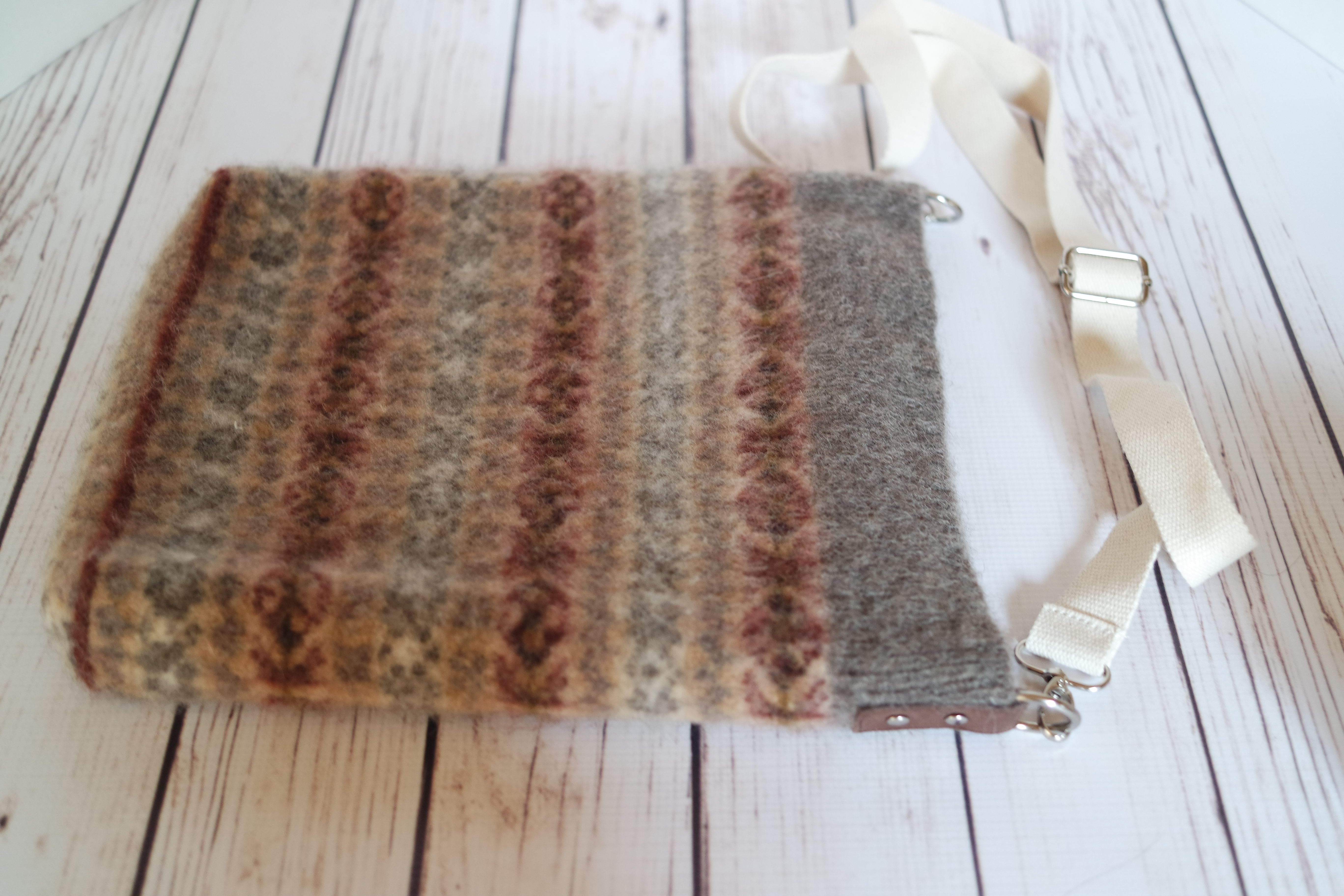 The sweater was worked in fingering weight yarn, so the fabric was pretty thin, and floppier than I like for a bag. It was also huge! About 17 inches wide and 16 inches deep and don’t forget all the ends that I was determined not to weave in. The solution to all those problems? Felt it! I’ve noticed other times when I felted bags or bowls that the opening tends to flare and get stretched out of shape, so I ran a length of cotton thread through the ribbing at the top. I also zipped the piece into a mesh bag before putting it in the washer. It didn’t get distorted at all in the felting process, and shrunk to just the right size, big enough to fit a three ring binder or sketchbook. I stopped at a craft store yesterday afternoon and found a shoulder strap and attachments.
