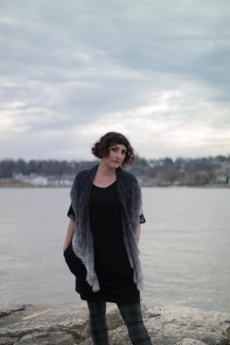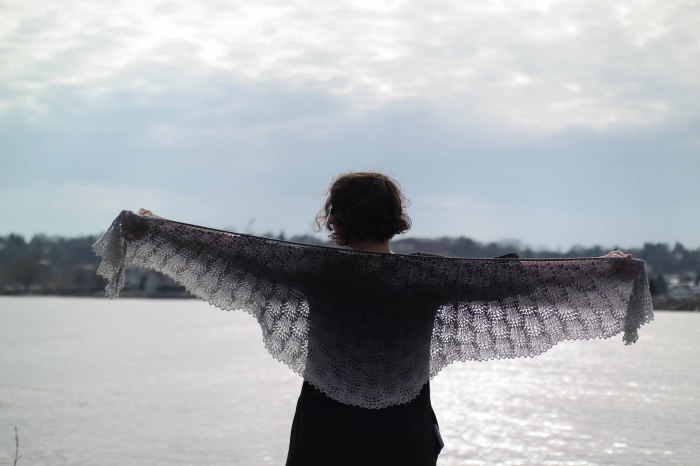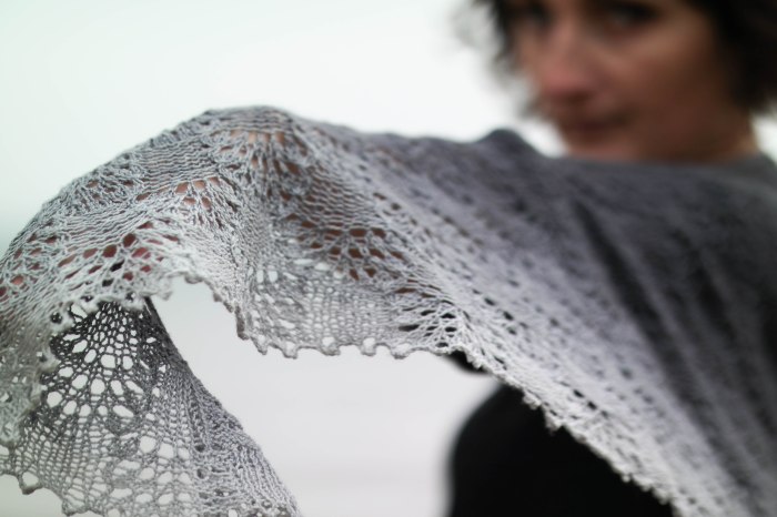 Storm Clouds is my latest self-published shawl pattern. It uses the same crescent shape construction as my Current shawl, but with a different lace pattern and a picot bind-off.