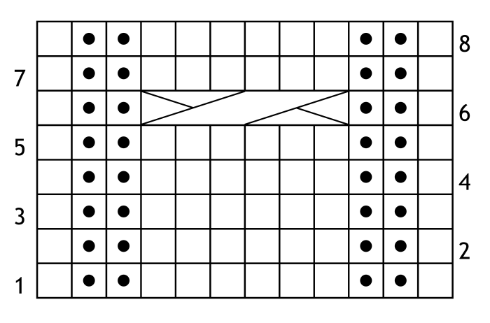The cable row is repeated every eighth row, so when there are seven rows above the pins it is time to work the cable row again.
