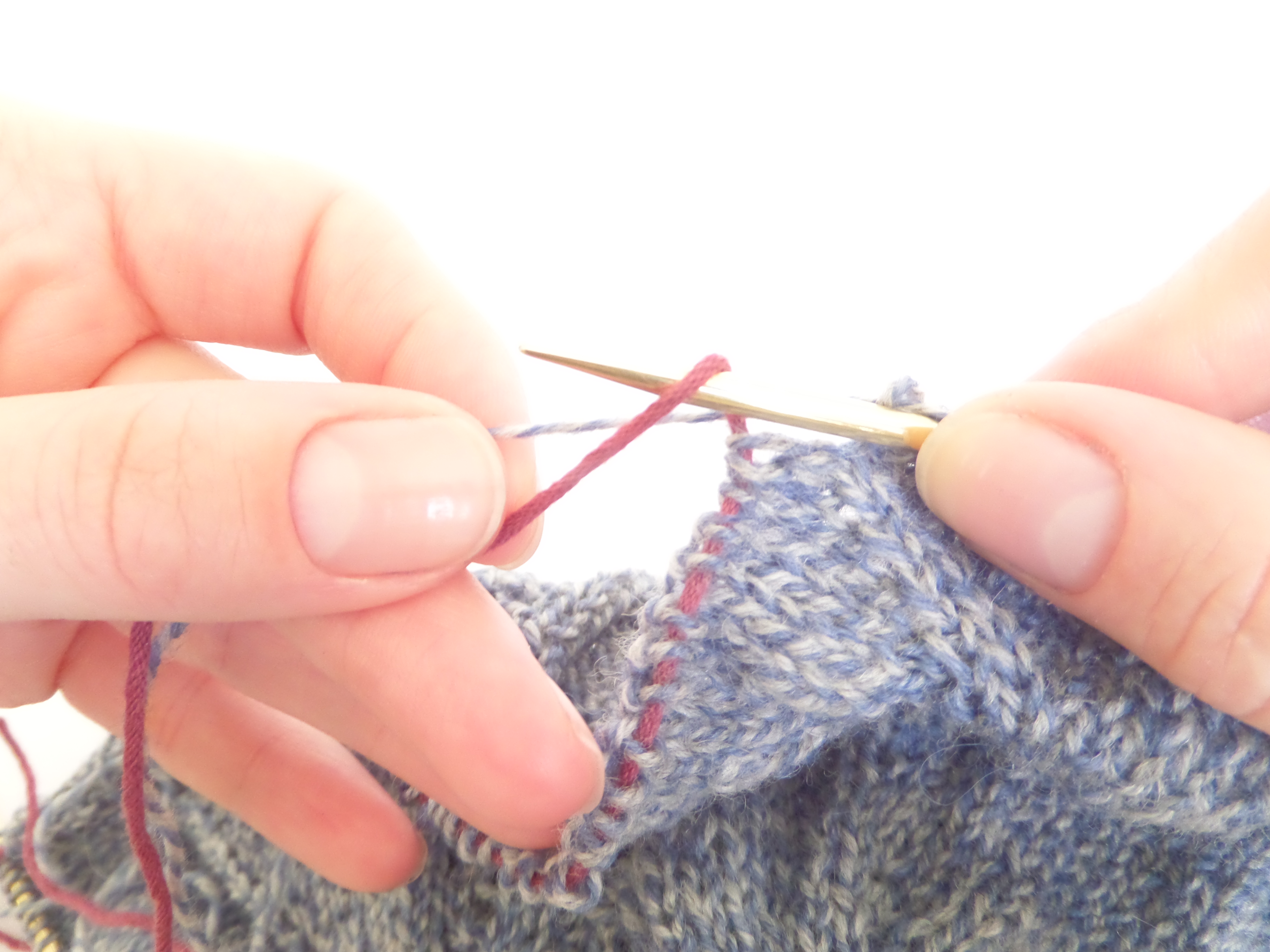 The sleeve stitches are held on waste yarn (in pink) and the working yarn is ready to cast on the underarm stitches.