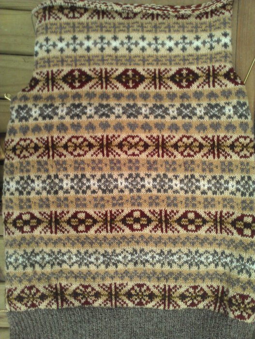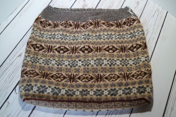 Last weekend there was a big sale on Craftsy classes. I had just finished reading Knitlandia by Clara Parks, in which she talks about filming her Craftsy class; Stashbusting: Make the Most of the Yarns You Have. After debating with myself most of the weekend, I bought the class and started watching it on Monday. My stash is pretty well organized, even though there is too much of it. I have given away or sold a lot of yarn in the last year, and I finished or ripped out almost all of my UFOs last month, but there was one last sweater, hidden away in a box under the bed. I knew I would never finish it, it didn’t even fit me anymore, but the yarn could not be reused. The sweater was worked in an allover Fair Isle pattern with ten different colors and color changes almost every row. I had cut the yarn every time I changed color, leaving the ends to weave in later. The daunting task of weaving in all those ends was another reason I knew I would never finish that sweater. So when Clara started talking about repurposing UFOs, I started thinking about what I wanted to do to that sweater. I stopped the video, got the sweater out from under the bed, and started cutting.